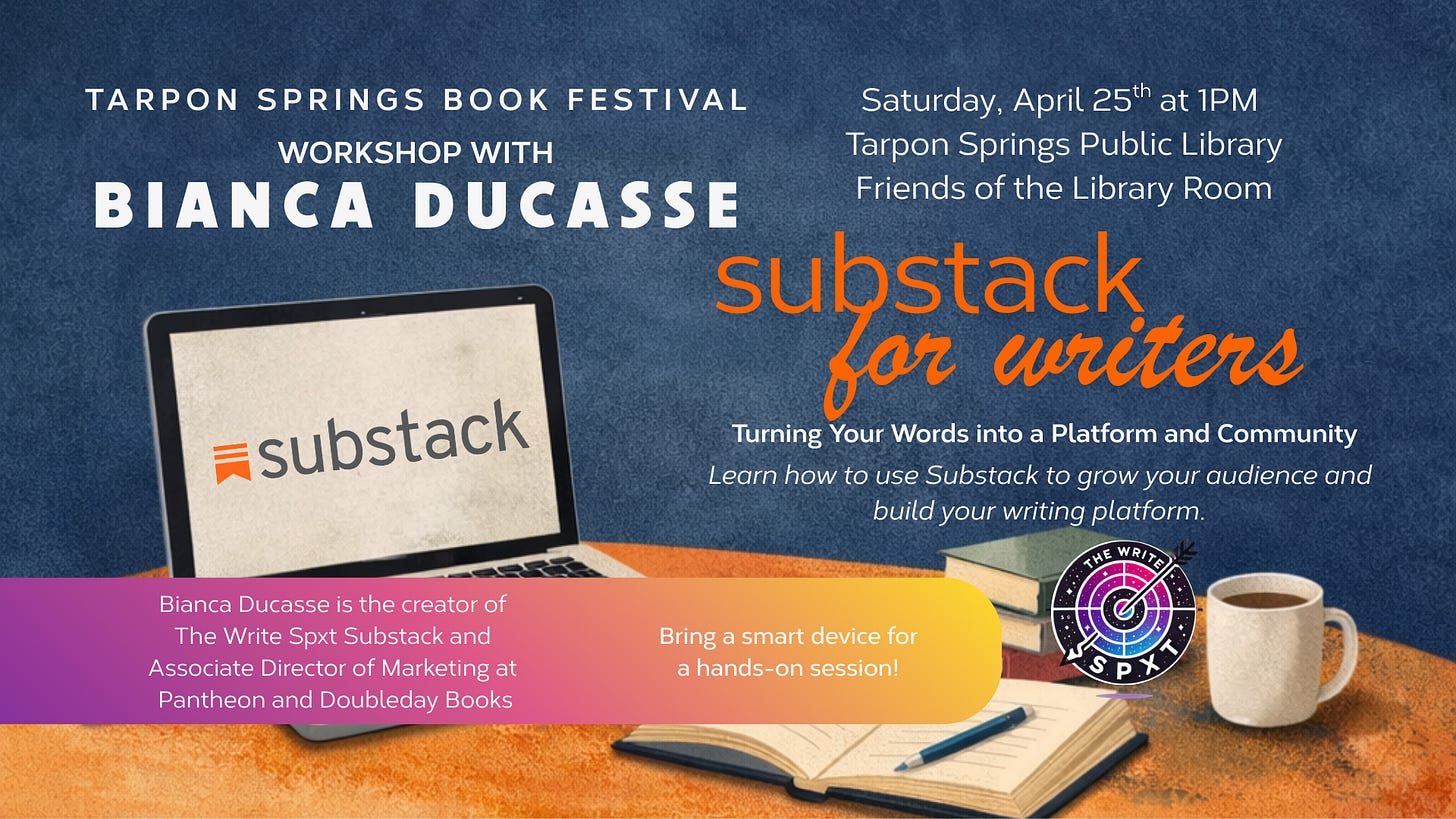 I am excited to share that I will be hosting a Substack for Writers workshop in collaboration with Tarpon Springs Book Festival! If you are in the area, would love to see you. The workshop is free for all.
